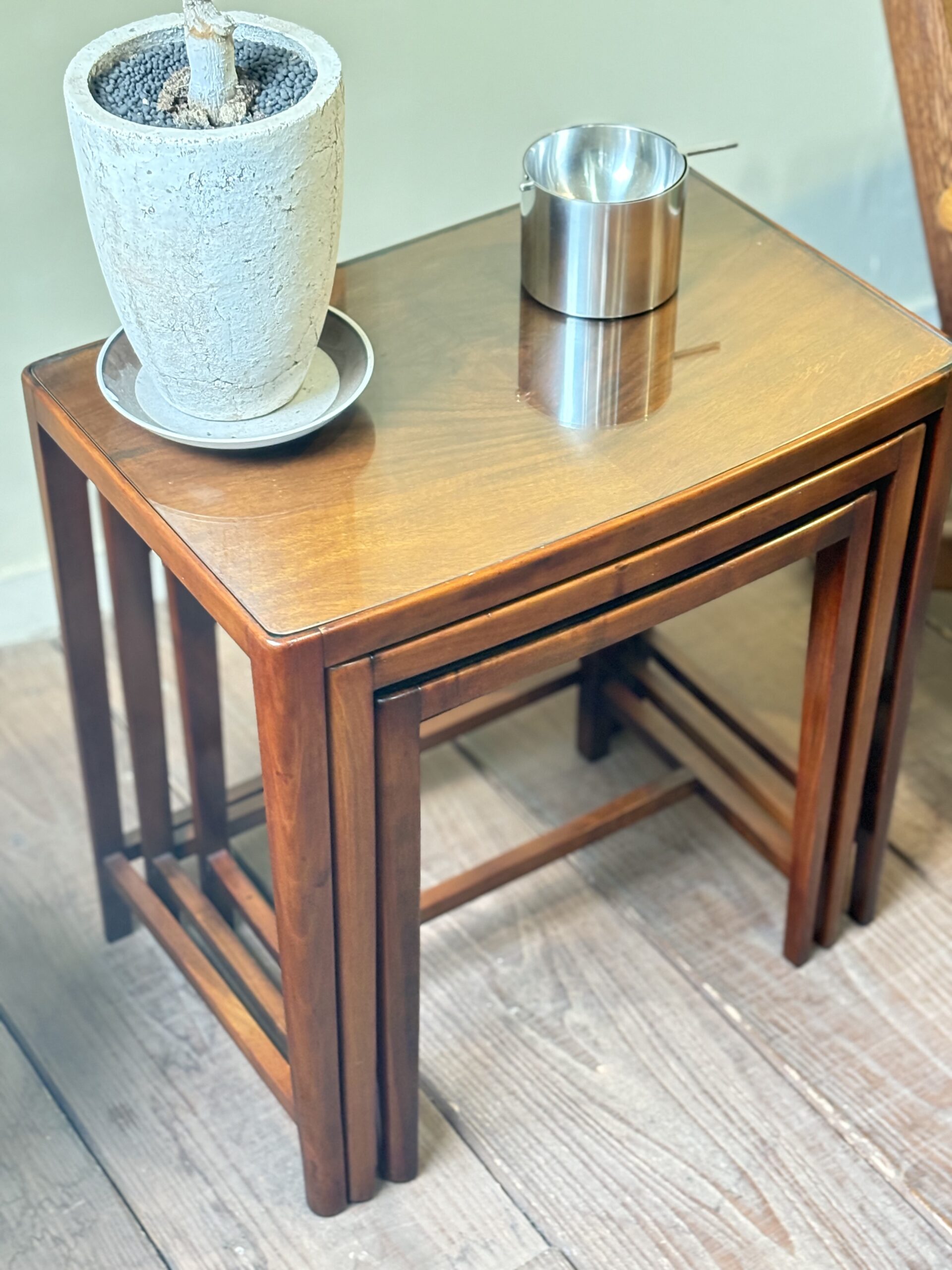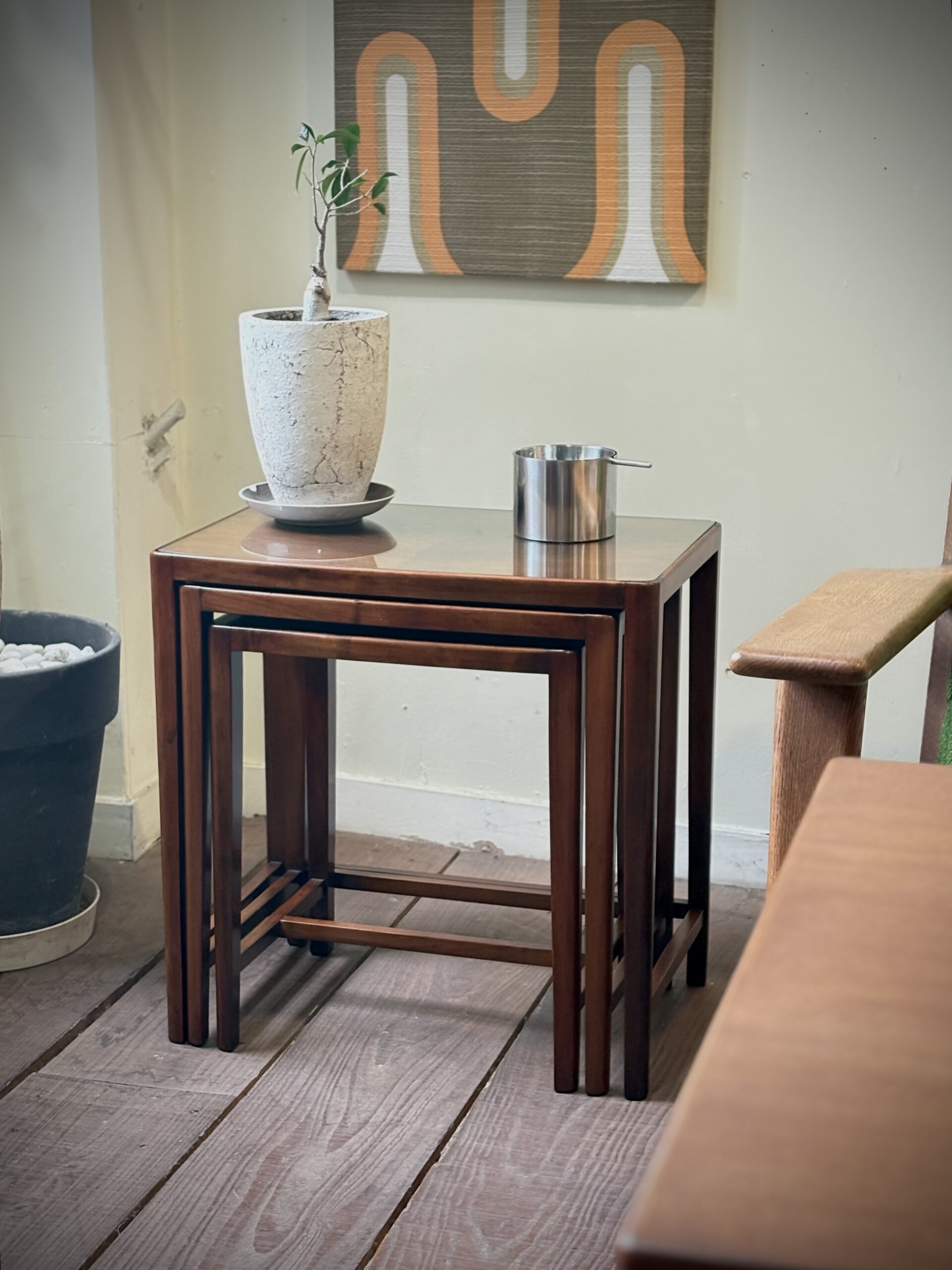 インテリア的にも魅力的なネストテーブルですが、必要に応じてテーブルや花台など使用できる実用的な面も魅力の一つです。